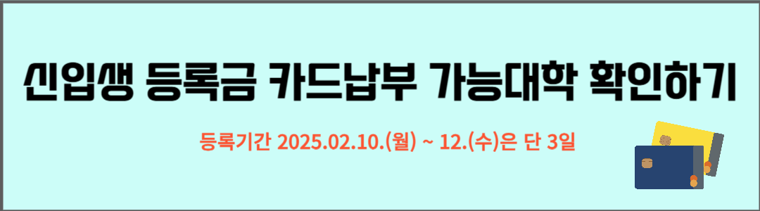 | 현대카드 | * 2~3개월 무이자 할부, * 10·12개월 부분 무이자 할부 (단, 아래 등록금 납부 가능 대학·대학원에 한해 혜택 제공) * 10개월 부분 무이자 할부 이용 시 1~5회차 * 12개월 부분 무이자 할부 이용 시 1~6회차 할부 수수료 회원 부담 |